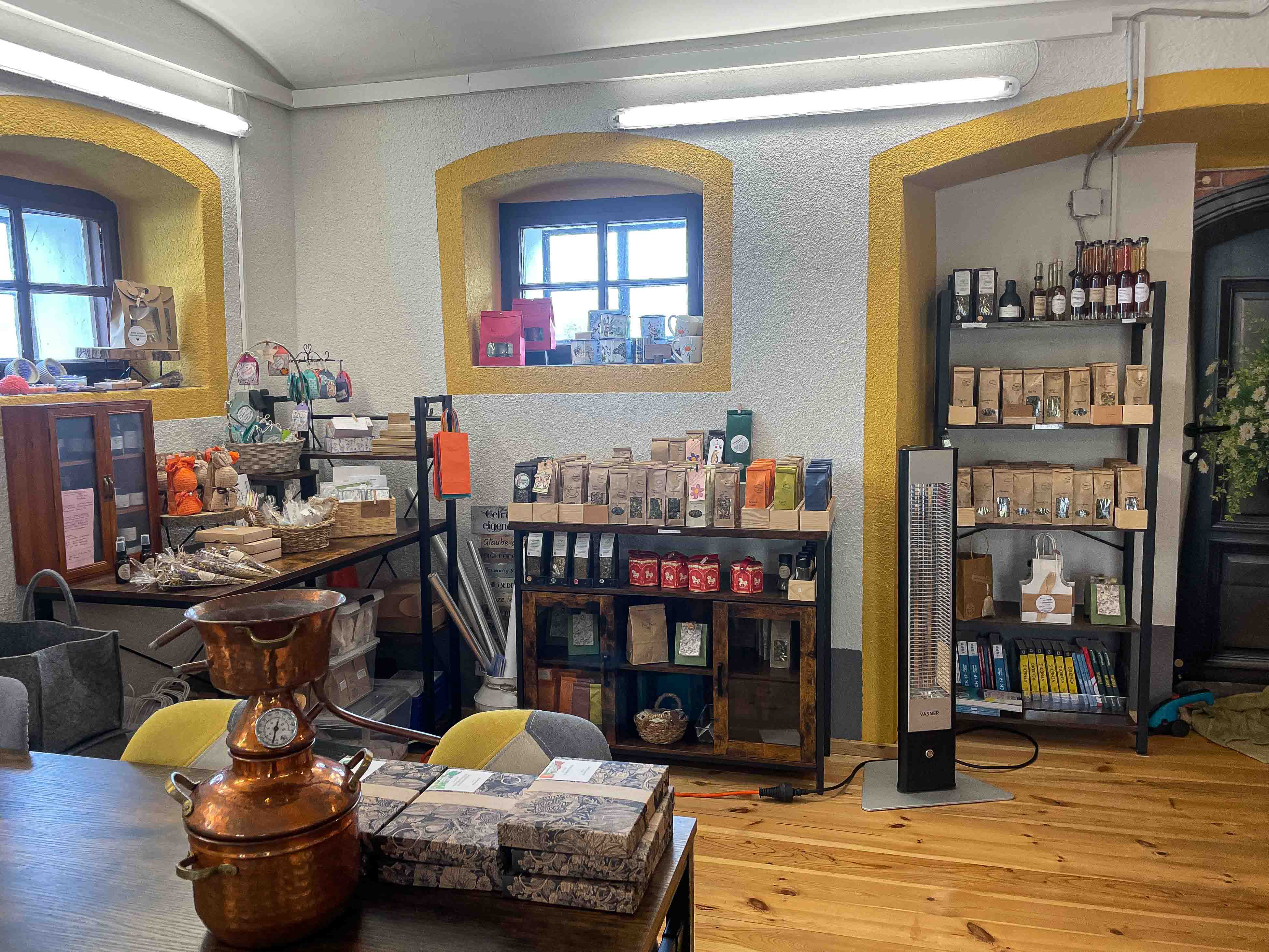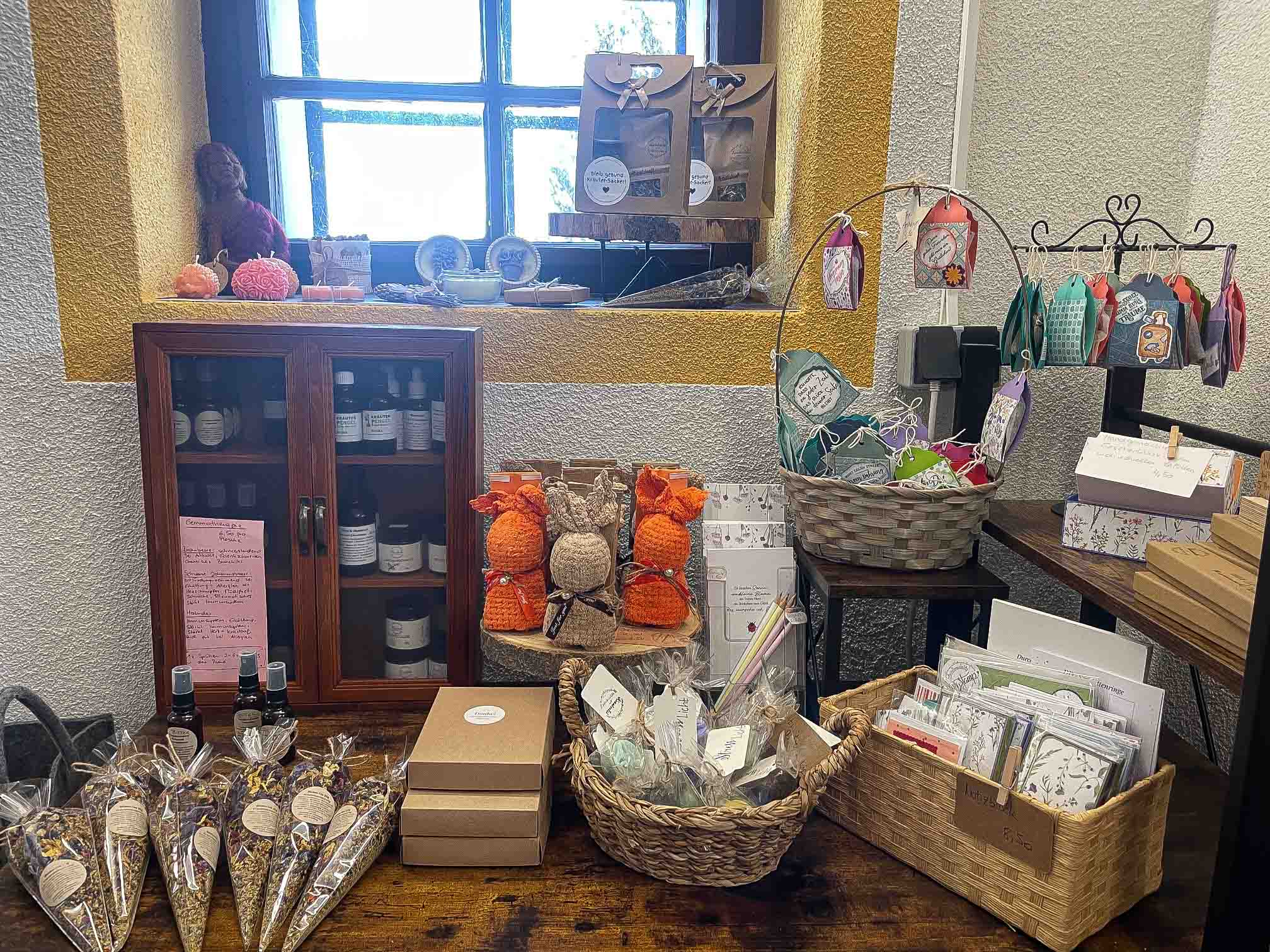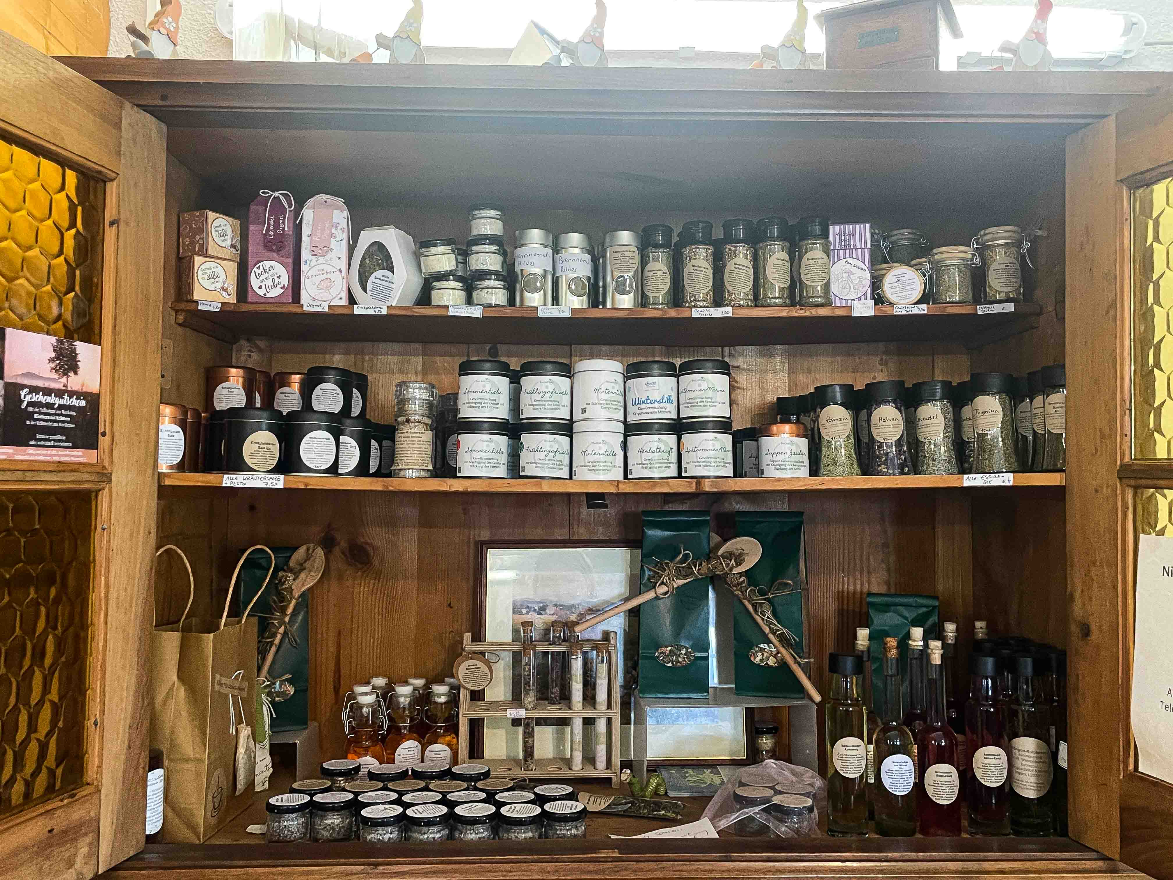 Ständige Produkte im Hofladen: Tee, Kerzen, Bücher, Likör, Salze, Kräutersamen, Kräuteressig, Aromaspray, Räucherwerk, Backmischungen, kleine Geschenke uvm.