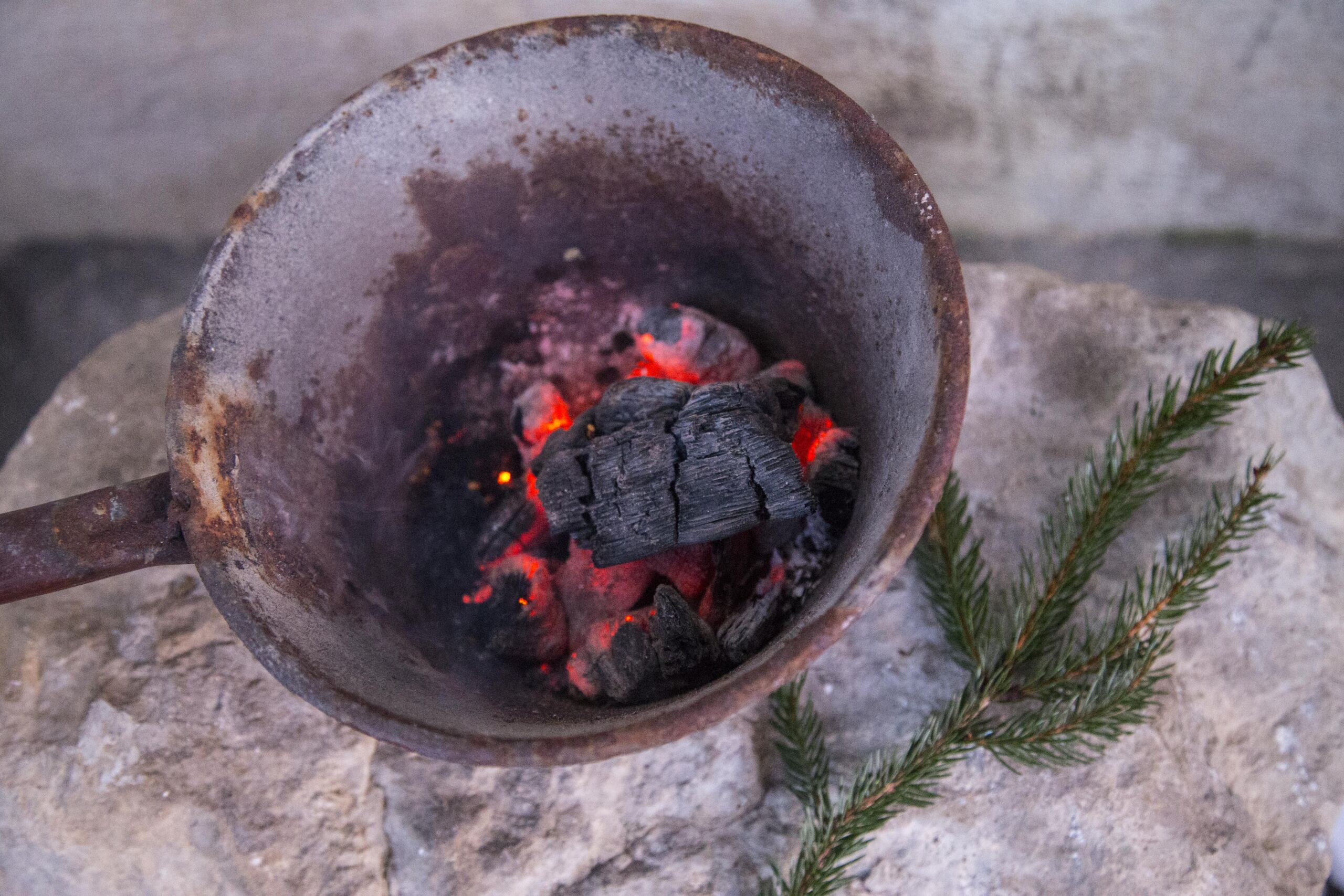 Räuchern zu Weihnachten hat bei uns in der Familie eine lange Tradition. Salbei, Fichtenharz, Eisenkraut, Speik, Engelwurz, Frauenmantel, Beifuß, Holunder, Johanniskraut, Lavendel, Wacholder, Minze, Mistel, Rosen, Rosmarin, Weihrauch – alles, was der Garten und die Speis hergibt, kommt in die fleckige Gusseisenpfanne auf die glühenden Kohlen. Dann beginnt die Prozession durch Haus und Hof.